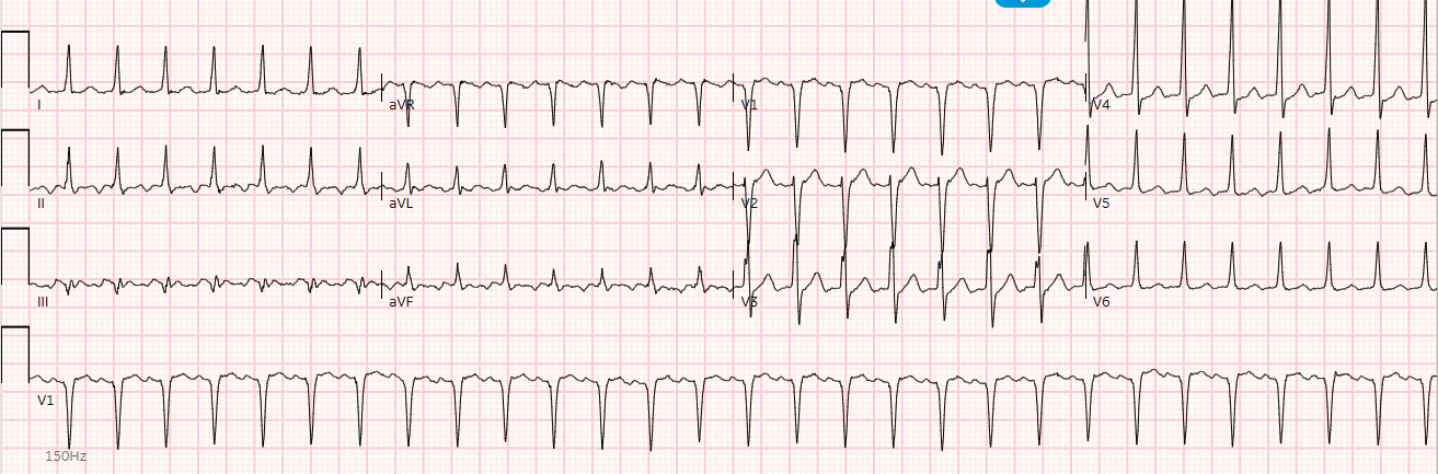 Man 69 jaar, 3 dagen ontslagen na CVA komt nu terug op SEH vanwege algehele malaise en koorts, met daarbij veranderd gedrag (anhedonie, moeheid, slaapstoornissen) en niet kunnen lopen. deze ECG is gemaakt dag na opname, is deze afwijkend?