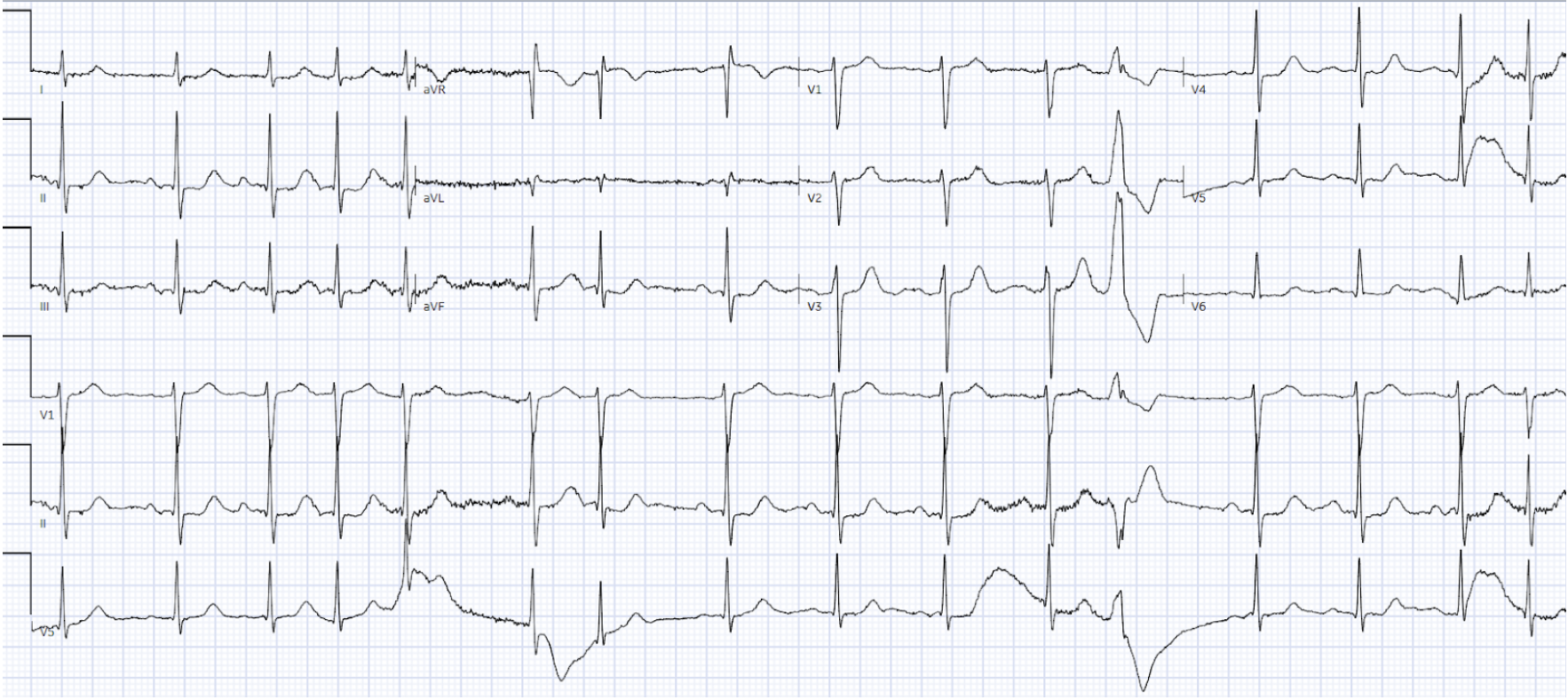 Conclusie: De ECG heeft afwijkingen. Er is een bekende Atriumflutter, extra ventricular complex te zien, echter geen tekenen van acute ischemie.