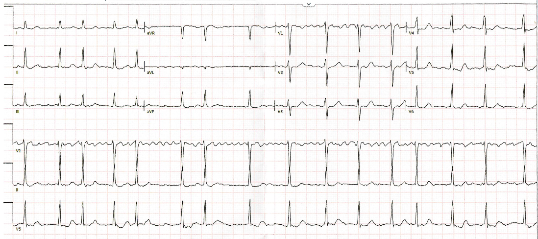 Atriumfibrilleren, 120-150 slagen/min, met normale geleidingstijden (PQ, QRS en QTc), een intermediaire hart-as, ontbrekende P-toppen, afwijkende QRS-morfologie (microvoltages in aVL) en normale ST morfologie.