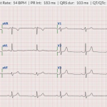 QRS: normaal moet het minder dan 100ms, en vanaf 120ms is er sprake van RBTB of LBTB. Maar in ons geval is het 103ms.